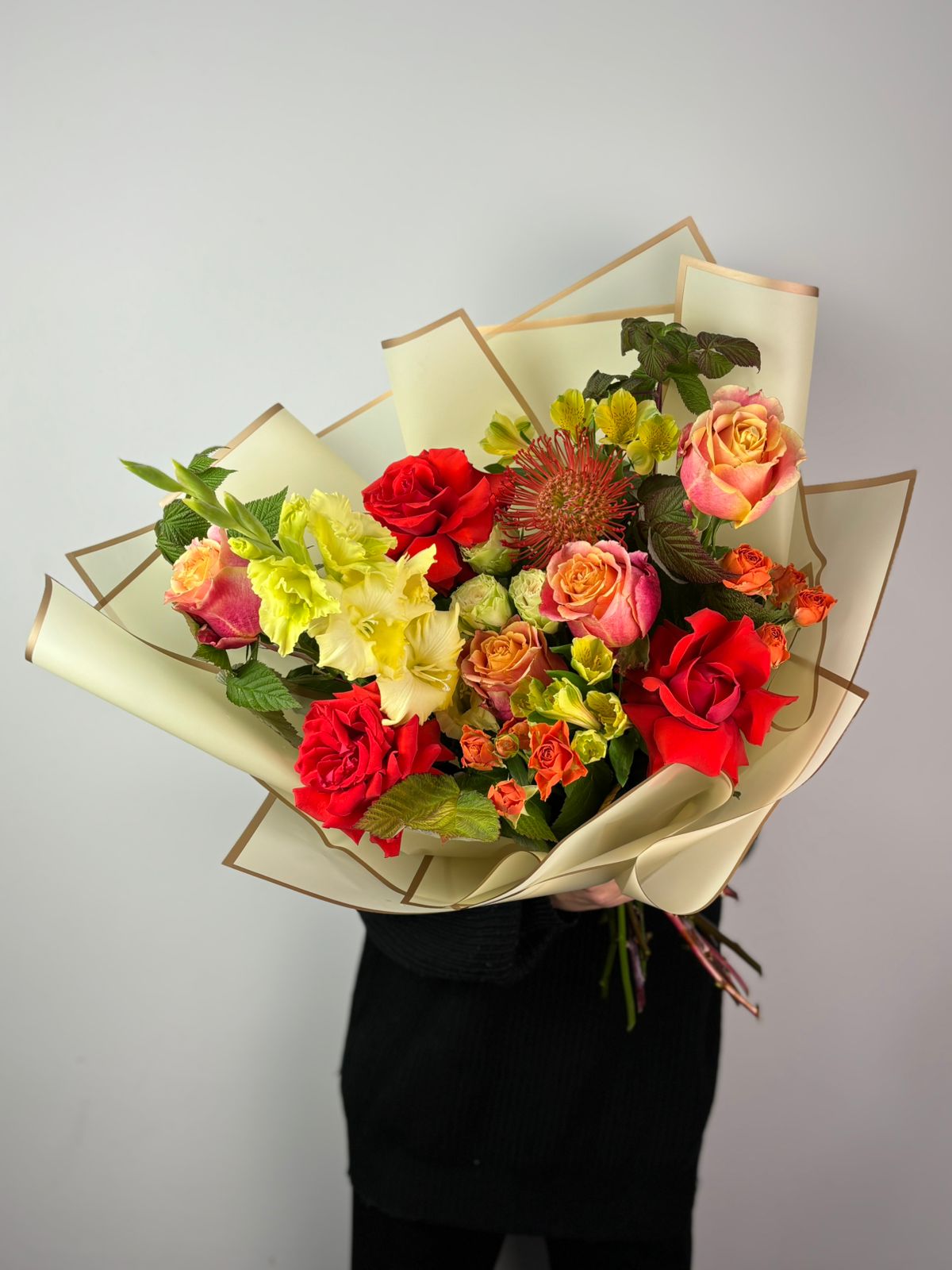 Букет "Огонь" — это воплощение страсти и энергии. Насыщенные цвета гладиолуса и роз создают эффект пламени, а альстромерия и зелень добавляют композиции свежести и объема. Этот букет станет отличным подарком для тех, кто ценит яркие и выразительные композиции.